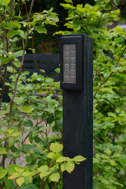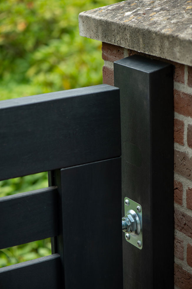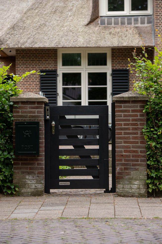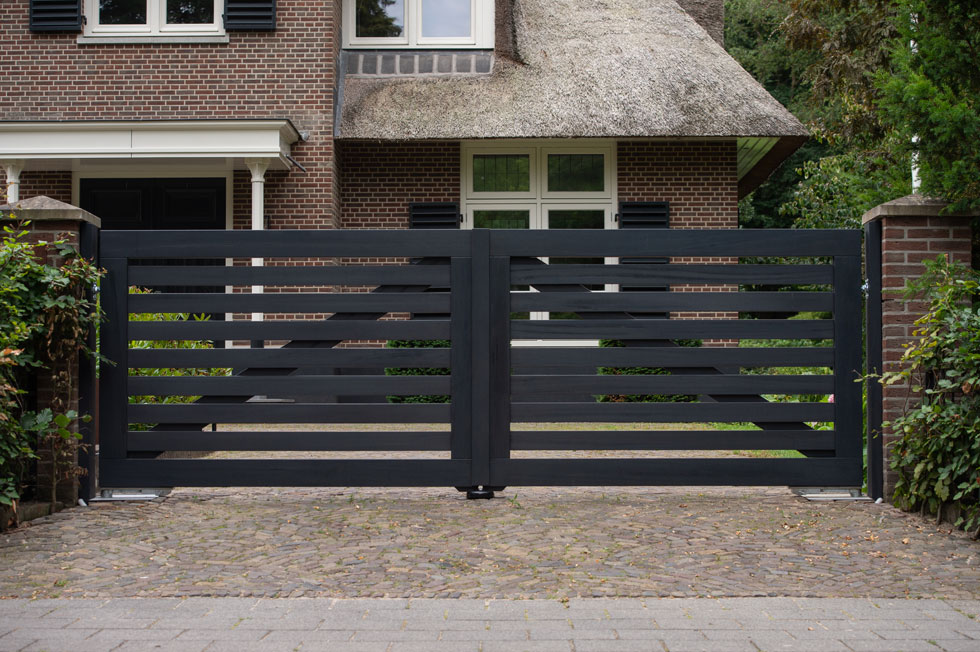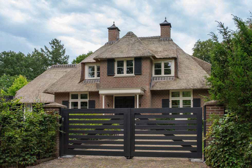 Bij dit rietgedekte landhuis in Diepenveen mochten we vier poorten plaatsen. Voor op de oprit twee dubbele draaipoorten, daar tussenin een looppoort en achterin de tuin nog een handbediende dubbele draaipoort. Het toegepaste model is Bologna waarbij de planken horizontaal zijn toegepast omdat dit mooi past bij de lamellen van het huis.