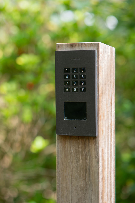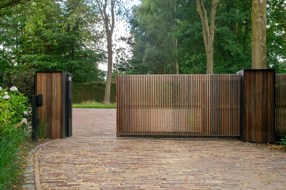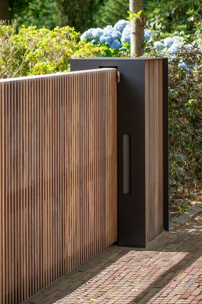 Schuifpoort en looppoort met moderne pilaren in Etten-Leur