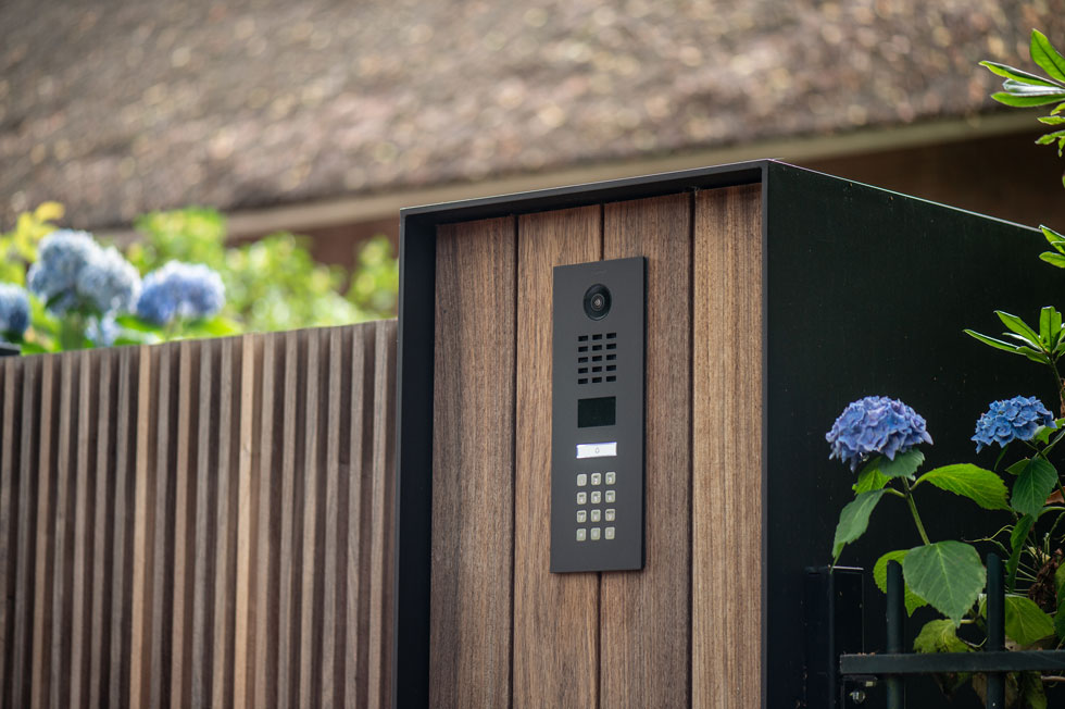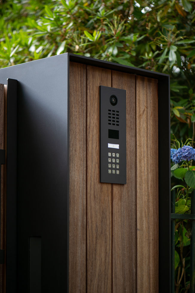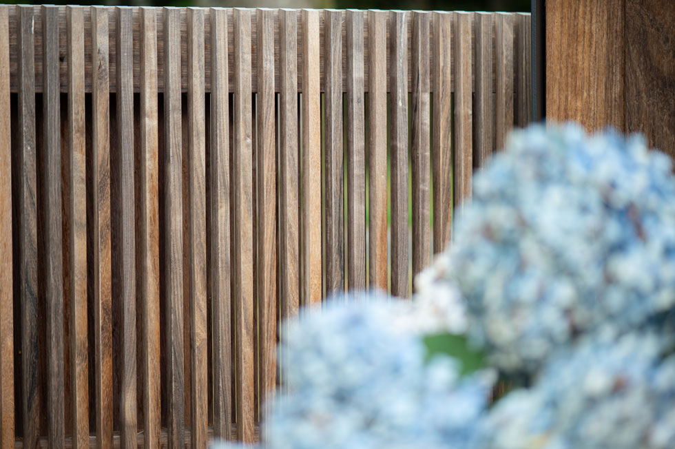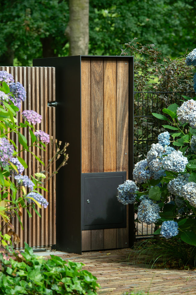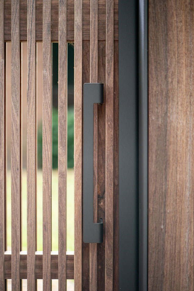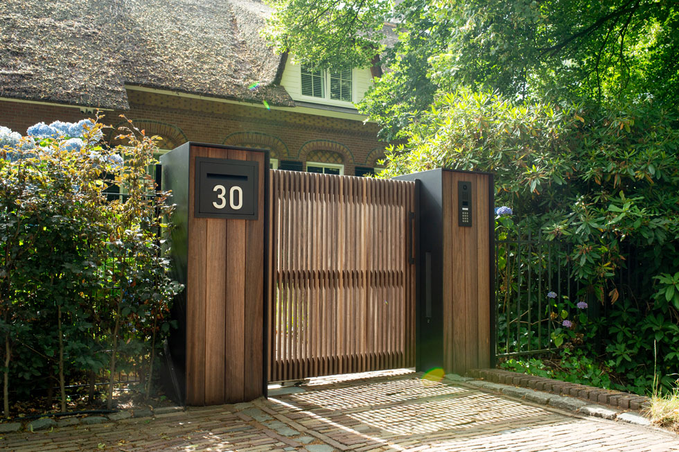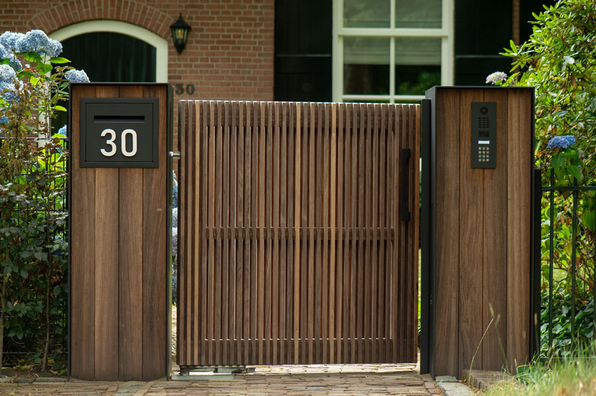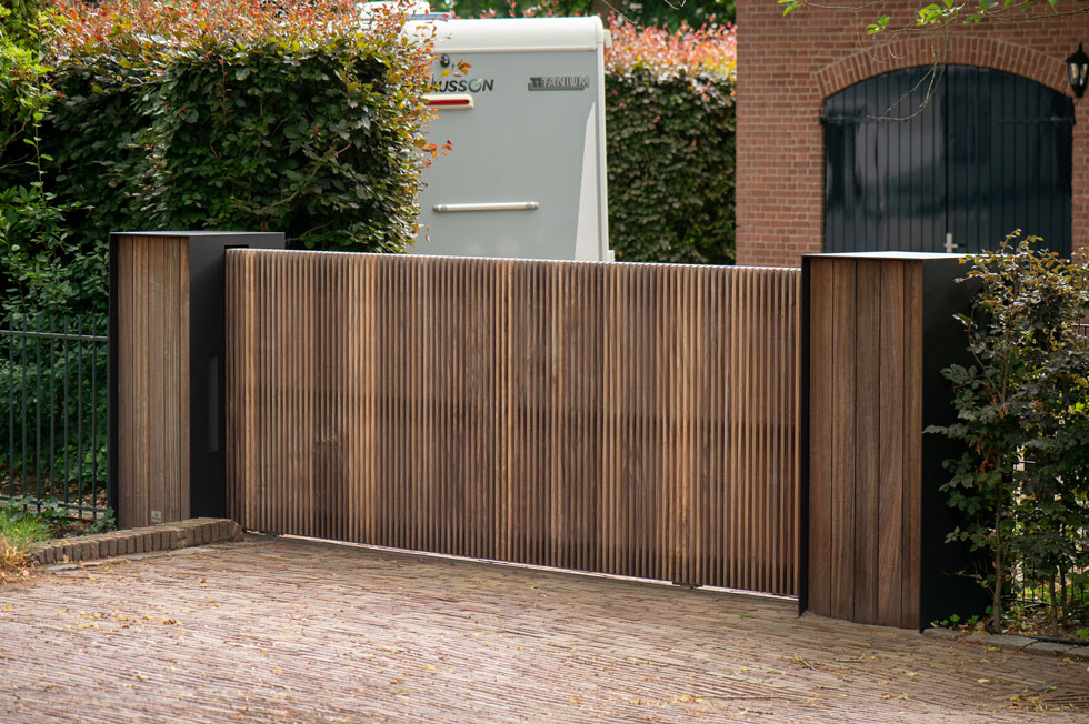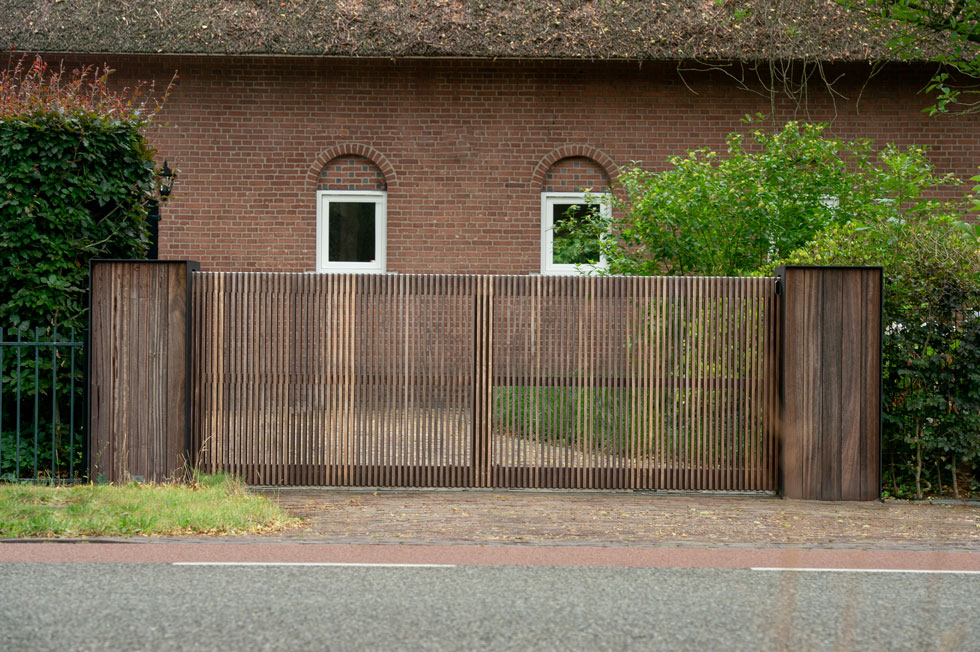 De eigenaren van deze statige boerderij in Etten-Leur kwamen bij ons voor een houten poort. Eentje die van hout moest zijn, maar niet al te landelijk. Maar het moest uiteraard wel bij de woning passen. We kwamen uit bij model Pavia met deze maatwerk pilaren. Een stalen U met daarin terugliggende planken. Een eigentijds ontwerp.